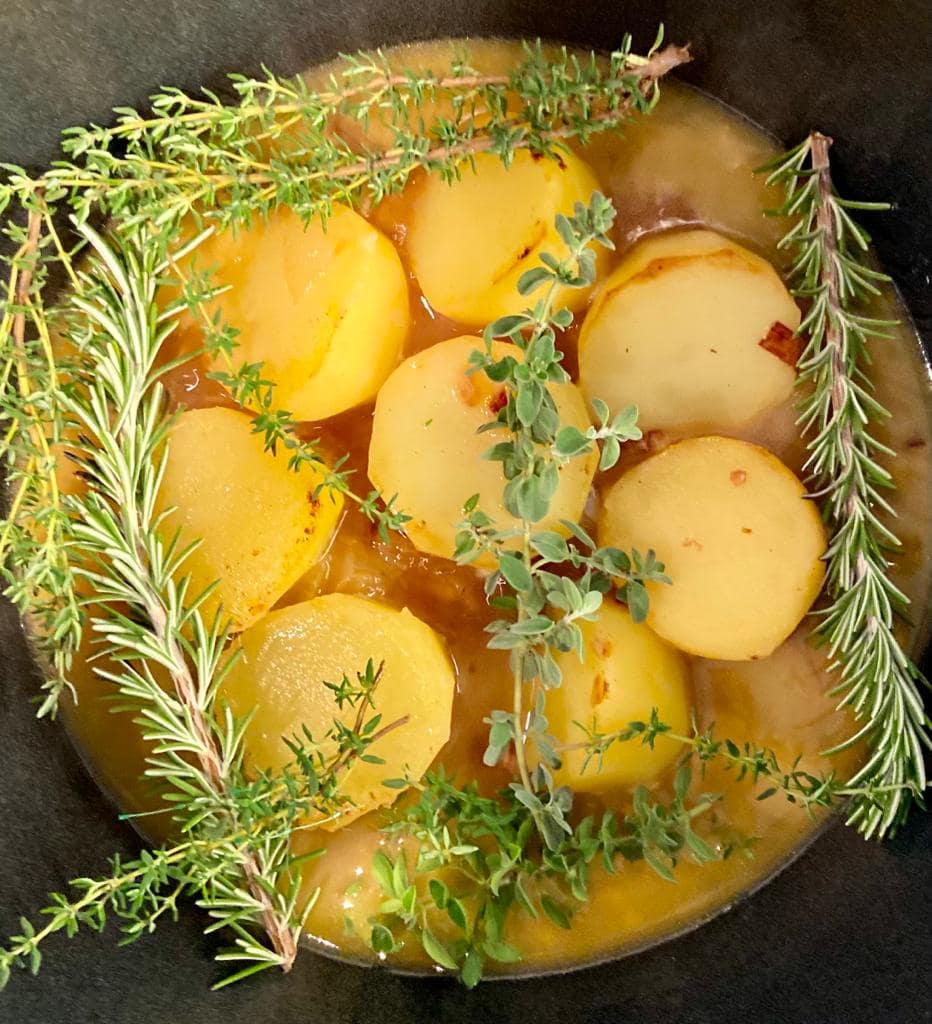 Voeg net zoveel bouillon bij tot de aardappels bijna onder staan. Doe er peper, grof zout en de kruiden bij.
