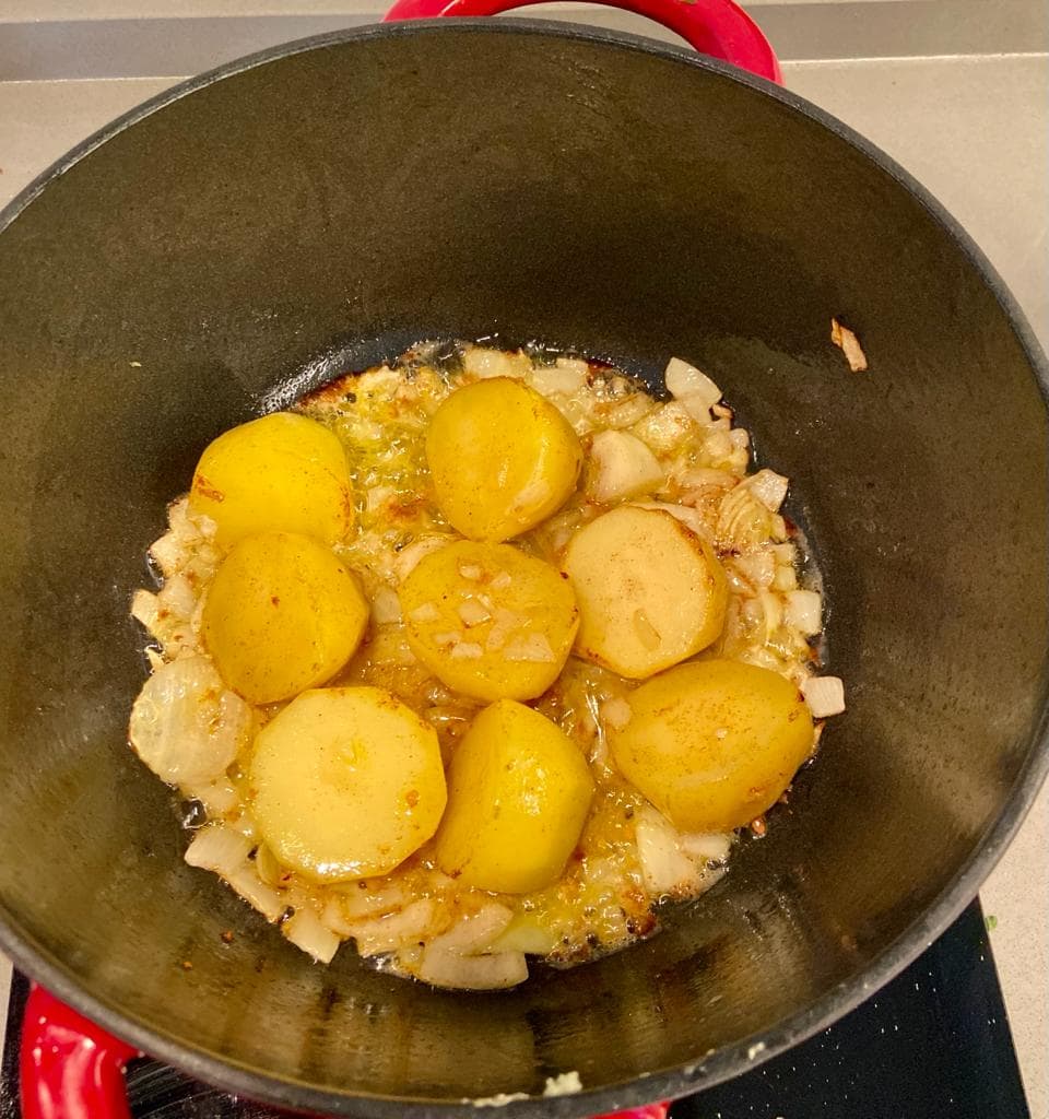 Verhit de olie en de boter in de gietijzeren pan en fruit hierin de ui en de knoflook. Voeg de aardappel bij en laat ze rondom mooi bruin worden.