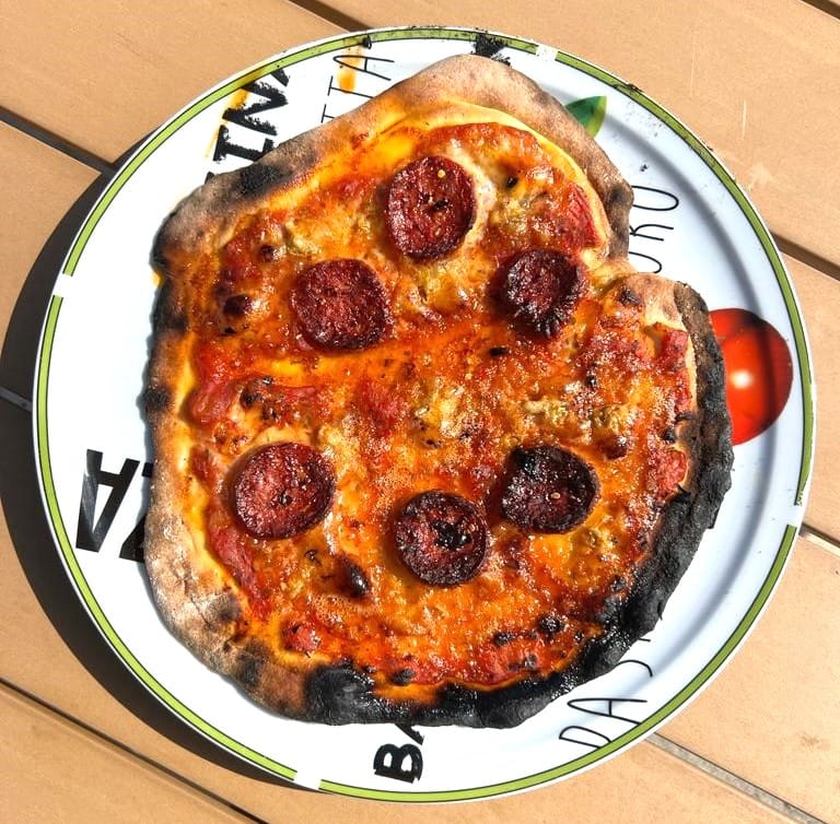 Wij kochten een echte pizza-oven! Meteen begon het experimenteren met recepten en baktijden. Het is ook even een kunst om de pizza van de schep af te schudden zonder dat het beleg alle kanten opvliegt. De eerste mislukte maar was toch wel eetbaar. Dat was een veelbelovend begin.