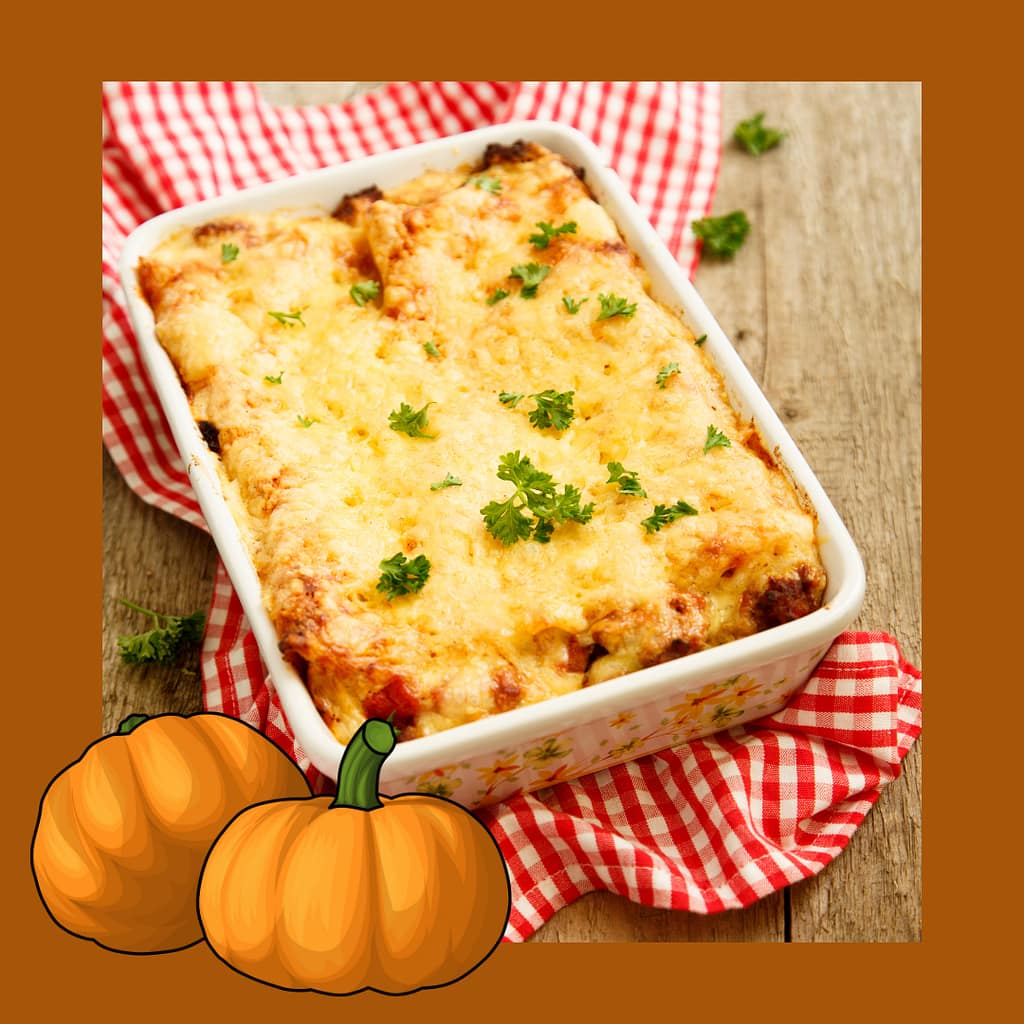 Maak laagjes van de saus, de pompoenvellen, courgettes, uien en de bechamelsaus.