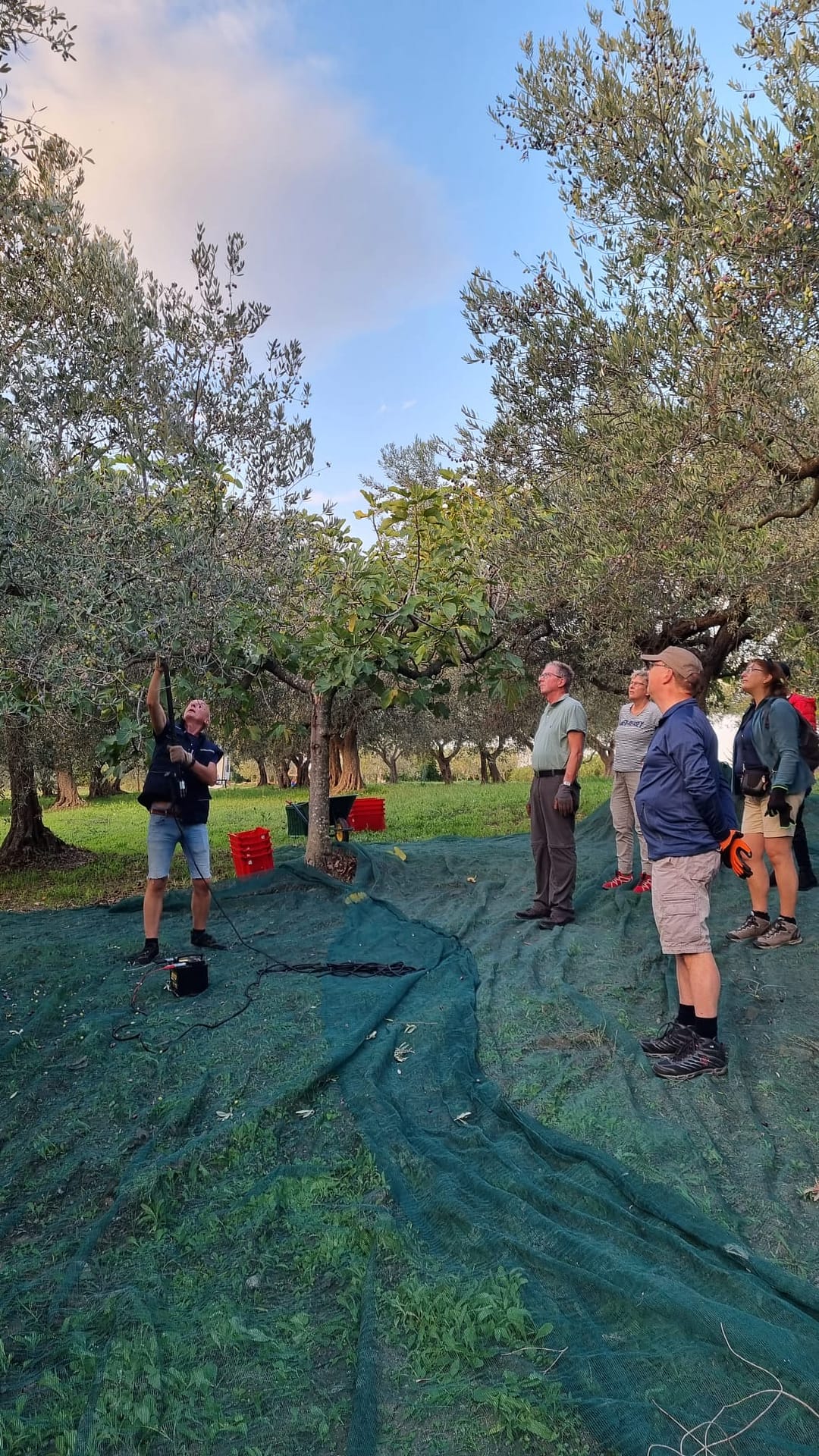 De sterken onder ons wisselen af met de elektrische harken, waarmee de olijven uit de bomen worden geschud. Heel bevredigend is het als je bij een volle boom honderden olijven naar beneden ziet komen.
