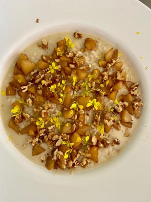 Doe op elk bord een schep risotto. Doe de peer en de noten er bovenop en garneer met de bloemetjes van het mosterdzaad of andere eetbare bloemen.